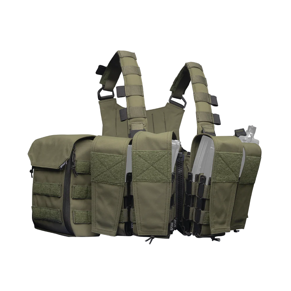 Assault Split-front Chest Rig ดีไซน์แยกส่วนหน้า ที่เน้นความคล่องตัว รองรับการปรับเปลี่ยนรูปแบบ โดยสามารถปรับเปลี่ยนการใช้งานได้ตั้งแต่รูปแบบ “Full Set” ที่สามารถบรรจุอุปกรณ์เสริมได้เต็มระบบ ไปจนถึงรูปแบบ “Micro Set” ที่เน้นความคล่องตัว หรือแม้แต่การแยกส่วนประกอบของ Chest Rig ด้านซ้ายและขวาแล้วนำมาประกอบเข้าด้วยกันผ่าน Buckle เพื่อใช้งานในโหมด Micro Chest Rig โดยส่วนประกอบทุกชิ้นผลิตจากวัสดุคุณภาพสูงอาทิ ซิปกระดูก YKK, และบัคเคิล UTX